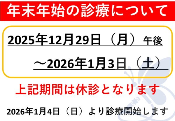 12月29日は午前までの診療、12月30日-1月3日まで休診となります。